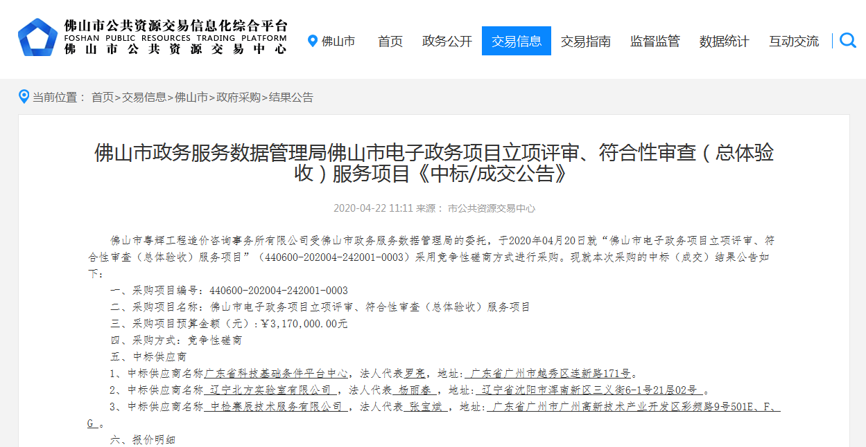 中檢賽辰技術(shù)服務(wù)有限公司(以下簡稱:賽辰)2020年4月22日以競(jìng)爭(zhēng)性磋商方式優(yōu)勝其他同行競(jìng)爭(zhēng)者,成功中標(biāo)【佛山市某某局佛山市XX項(xiàng)目立項(xiàng)評(píng)審、符合性審查(總體驗(yàn)收)服務(wù)項(xiàng)目】。